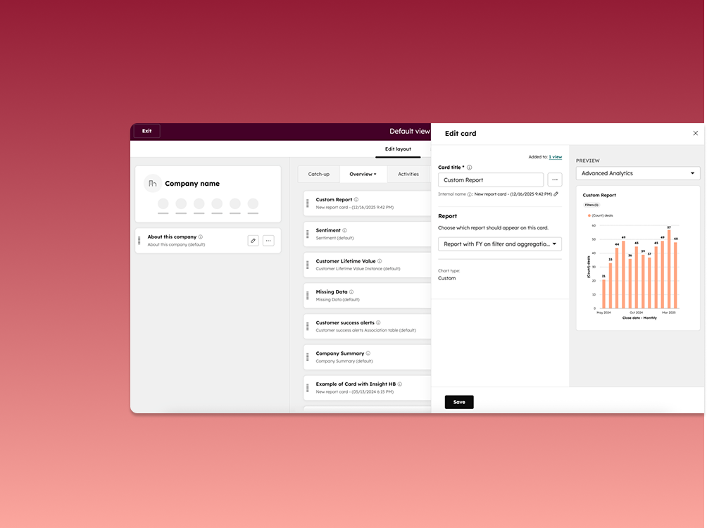Skapa först en anpassad rapport i HubSpot. Därefter går du in i vyinställningarna för exempelvis kontakt- eller företagsvyn och lägger till ett så kallat “report card”. Du kan visa data för just det objekt du tittar på, för associerade poster, eller helt utan filter. Det gör funktionen flexibel både för marknad, sälj och service.